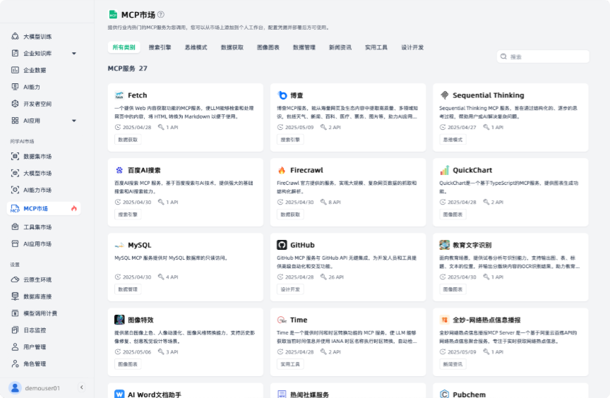 平台自有数据、大模型、AI应用等多个市场,降低企业智能应用建设门槛,加速赋能企业智能化